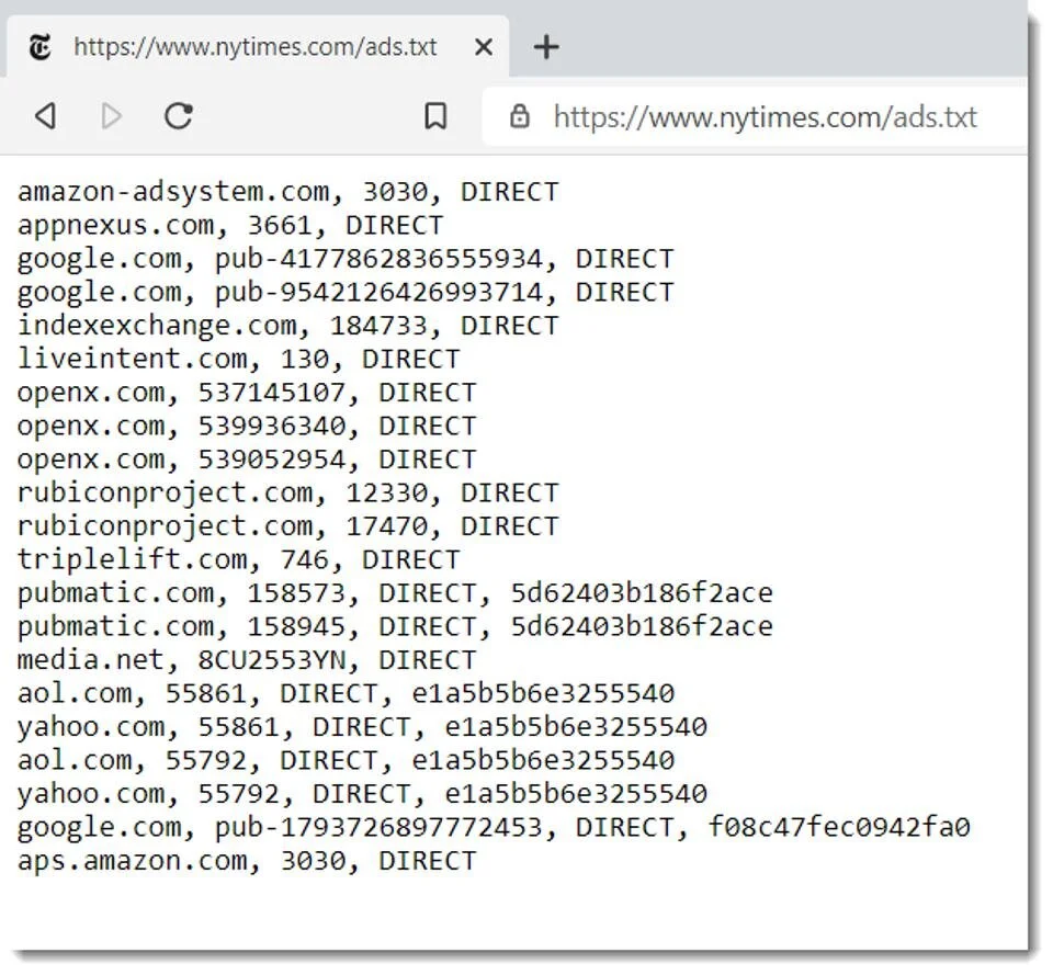 He dicho a lo largo de los años que los especialistas en marketing no deberían asumir que ads.txt resuelve el fraude publicitario. ads.txt es un protocolo de la IAB (Interactive Advertising Bureau) que se promocionó para aumentar la transparencia y reducir el fraude publicitario al hacer que los Publishers declaren qué Exchanges estaban autorizados a vender su inventario de anuncios. Cada línea del archivo de texto ads.txt contendría 3 elementos: el nombre del Exchange, el sellerID de ese dominio en el Exchange, el tipo (DIRECTO o REVENDEDOR) y, opcionalmente, un cuarto elemento, el ID del certificado emitido a ese Publisher. por una autoridad de certificación.