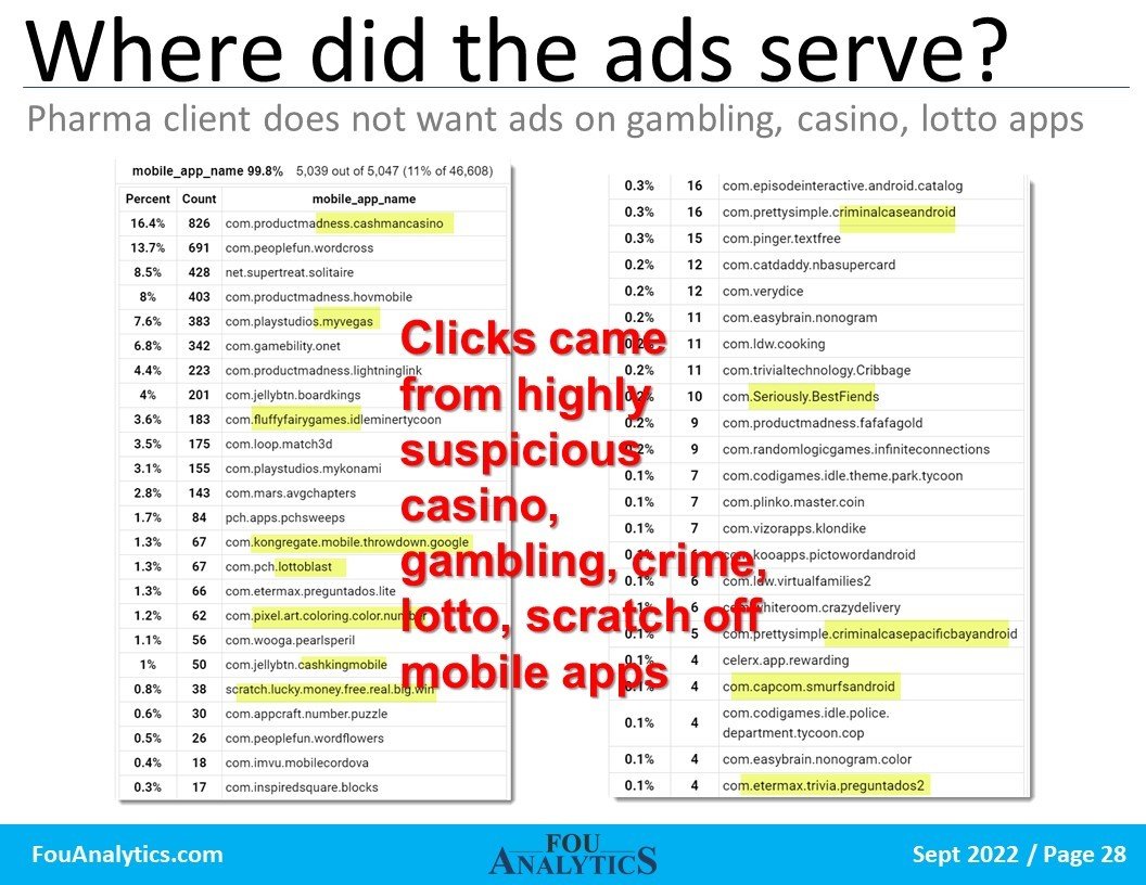 Cuando pides al proveedor de tecnología publicitaria una lista de dónde se publicaron tus anuncios, es posible que hayas visto algo parecido a la lista de la siguiente diapositiva. Fíjese en las aplicaciones de casino, juegos de azar, lotería, rasca y gana, "pitufos" y criminales de la lista. Los proveedores de tecnología publicitaria que venden servicios de segmentación de audiencias se apresurarán a decirle "no se preocupe, estamos segmentando a los médicos por número de NPI, así que aunque estas aplicaciones parezcan extrañas, le aseguramos que sus anuncios se muestran a los médicos a los que quiere dirigirse". ¿De verdad? ¿Qué hay de los bots que se hacen pasar por médicos fingiendo visitas a sitios web específicos? ¿Qué hay de los bots que copian y reproducen una cookie que crees que corresponde a un médico basándose en el número NPI? Cierto, no has tenido en cuenta eso, ¿verdad? Además, incluso si el anuncio estuviera dirigido al médico correcto, ¿Estaría en la mentalidad correcta para ver y hacer clic en su anuncio cuando está jugando a Subway Surfers o Candy Crush? No, no lo estarían.