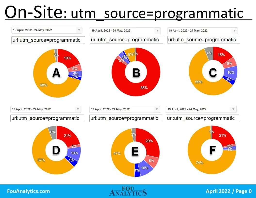 Los anunciantes con los que he hablado se apresuran a defender la segmentación por audiencias, porque han pagado por ella durante años y sería vergonzoso darse cuenta o admitir que no funciona. La segmentación por audiencias "debe estar funcionando bien porque estamos obteniendo tasas de clics mucho más altas" que si sólo colocáramos anuncios en los sitios de los publishers. Bueno, está bien que tengas muchos clics, pero ¿te has preguntado si los clics son de humanos o de bots? ¿Tiene las herramientas adecuadas para comprobarlo? Google Analytics no le muestra lo que aparece en el siguiente gráfico. Su proveedor de verificación de fraude tampoco lo hace. El siguiente gráfico muestra los clics que llegaron a las páginas de destino de los anunciantes, desde "utm_source=programmatic". Por si no lo sabías, en FouAnalytics, el naranja significa bots declarados y el rojo bots malos. El azul oscuro significa clics humanos. Si entrecierras los ojos, podrás ver las pequeñas astillas azules en estos seis gráficos de donuts. Entre el 1 y el 4% de los clics en estas campañas dirigidas al público son de humanos. Entonces, ¿qué has dicho de que conseguir muchos clics significa que la segmentación por público está funcionando muy bien? Ciertamente tienes muchos clics.