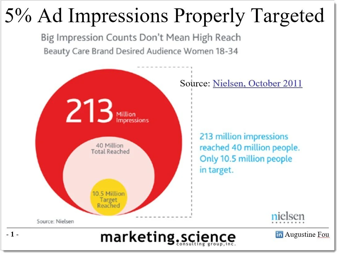 Empecemos por el nivel alto y luego profundicemos. Ya en 2011, Nielsen informaba de que sólo el 5% de los anuncios estaban siquiera correctamente segmentados (diapositiva inferior). De 200 millones de impresiones compradas con segmentación de audiencia, solo 10 millones alcanzaron el objetivo previsto. Desde entonces, Nielsen ha eliminado esa publicación del blog y el estudio de caso, porque esa realidad habría obstaculizado o estropeado el crecimiento desenfrenado de los ingresos por segmentación de audiencias para las empresas de tecnología publicitaria. Los anunciantes tenían que creer que funcionaba; eso es una gran noticia para las empresas de tecnología publicitaria que ofrecen segmentos de audiencia en venta y nadie se enteraría.