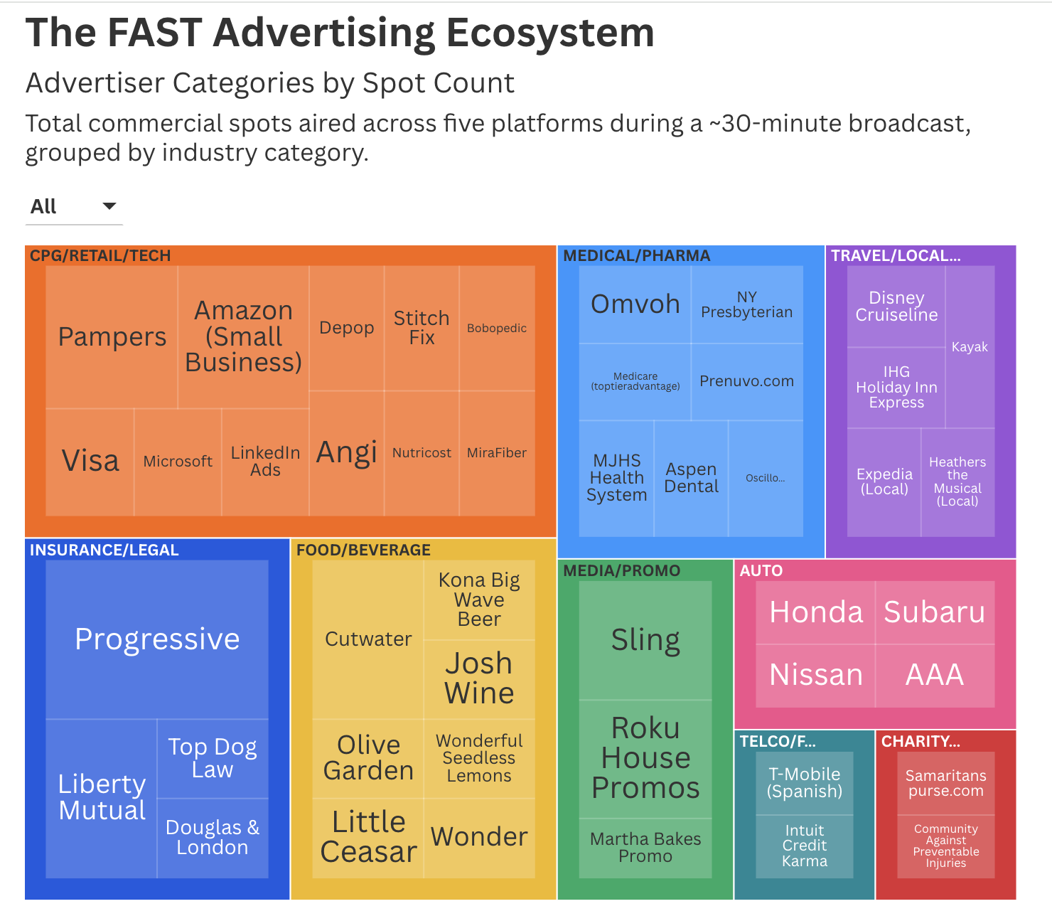 El mercado FAST que retrata este ejercicio no está sostenido por una supuesta nueva economía de anunciantes, sino por categorías muy reconocibles: seguros, pharma, direct response, consumo y compras programáticas fragmentadas.