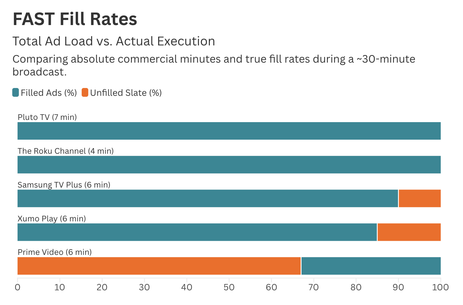 Uno de los aciertos del artículo de FASTMaster es que no mete todos los problemas de fill en el mismo saco, porque no responden a la misma lógica. En Samsung TV Plus y Xumo Play vemos una fricción de inserción que podríamos llamar slate bleed. Traducido a algo más sencillo: pequeños restos de pantalla de continuidad o aire muerto al final de cortes que, en general, sí estaban vendidos. Según el gráfico de Unsold Airtime, Samsung acumula 0,67 minutos de inventario no vendido y Xumo 0,93 minutos. No parece una avería estructural del sistema, sino más bien el subproducto de una inserción muy fragmentada, con duraciones cortas y un ajuste imperfecto entre la suma de creatividades y la longitud prevista del bloque. Con Prime Video, en cambio, el problema es otro. Aquí no estamos hablando de un simple residuo técnico, sino de algo bastante más serio: wholesale pod failure. Es decir, bloques completos sin demanda suficiente, resueltos con pantallas de “Be Right Back” de hasta 120 segundos. El gráfico le atribuye 4 minutos de airtime no vendido y un fill rate del 33%, y esto importa porque cambia por completo el diagnóstico. No es lo mismo una plataforma que rellena casi todo pero deja 10 o 15 segundos colgando al final de un pod, que una plataforma que directamente está construyendo una carga comercial que luego su sistema de demanda no es capaz de sostener. Son dos problemas distintos. Uno habla de precisión operativa. El otro habla de una desconexión bastante seria entre oferta disponible y capacidad real de monetización.