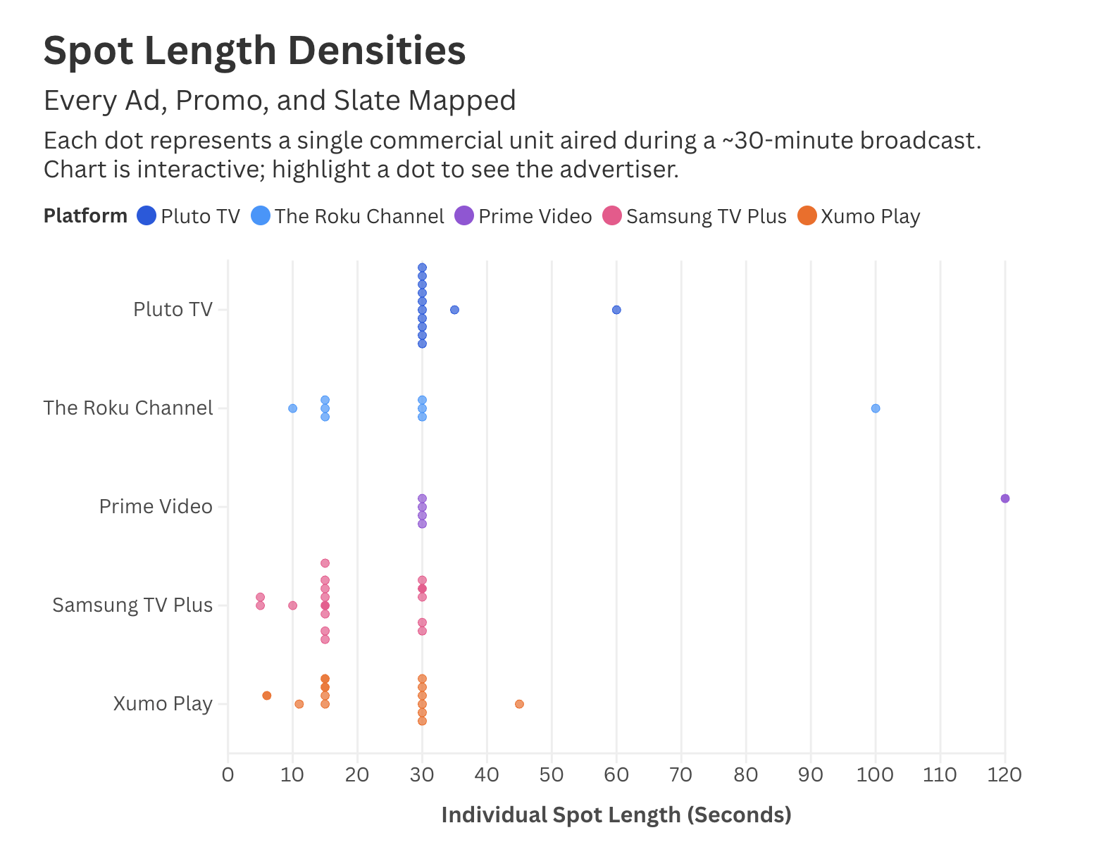 La tercera capa del análisis, y probablemente una de las más útiles para cualquiera que trabaje en programática, es la composición interna de los pods. Según el gráfico de densidad de duraciones, Pluto TV y Roku se acercan mucho más a una lógica televisiva clásica. Pluto se apoya sobre todo en spots de 30 segundos, con alguna ventana de 60 segundos. Roku, por su parte, llega a incluir un bloque de 100 segundos para una pieza de Medicare, algo muy reconocible para cualquiera que haya trabajado monetización de daytime cable o inventario de respuesta directa orientado a targets maduros. En el extremo opuesto están Samsung TV Plus y Xumo Play, donde aparece una concentración mucho mayor de piezas cortas: 15 segundos, 10 segundos e incluso 6 segundos en algunos casos. Podríamos llamarlo programmatic micro-cramming. La expresión no suena especialmente elegante, pero describe bastante bien lo que está pasando. No se trata solo de vender inventario, sino de exprimir el número de impresiones dentro de pods relativamente cortos mediante una acumulación de creatividades muy breves. Ese enfoque tiene una doble lectura: por un lado, permite aumentar la ocupación comercial y capturar demanda más dispersa. Por otro, eleva la probabilidad de desajustes al final del bloque y puede aumentar la sensación de saturación. No es solo una diferencia de formato, es una diferencia de filosofía comercial. Dicho de forma más directa: algunas plataformas parecen optimizadas para maximizar el valor unitario de cada interrupción. Otras, en cambio, parecen diseñadas para sacar el máximo volumen posible de impresiones, aunque eso complique la limpieza de ejecución.