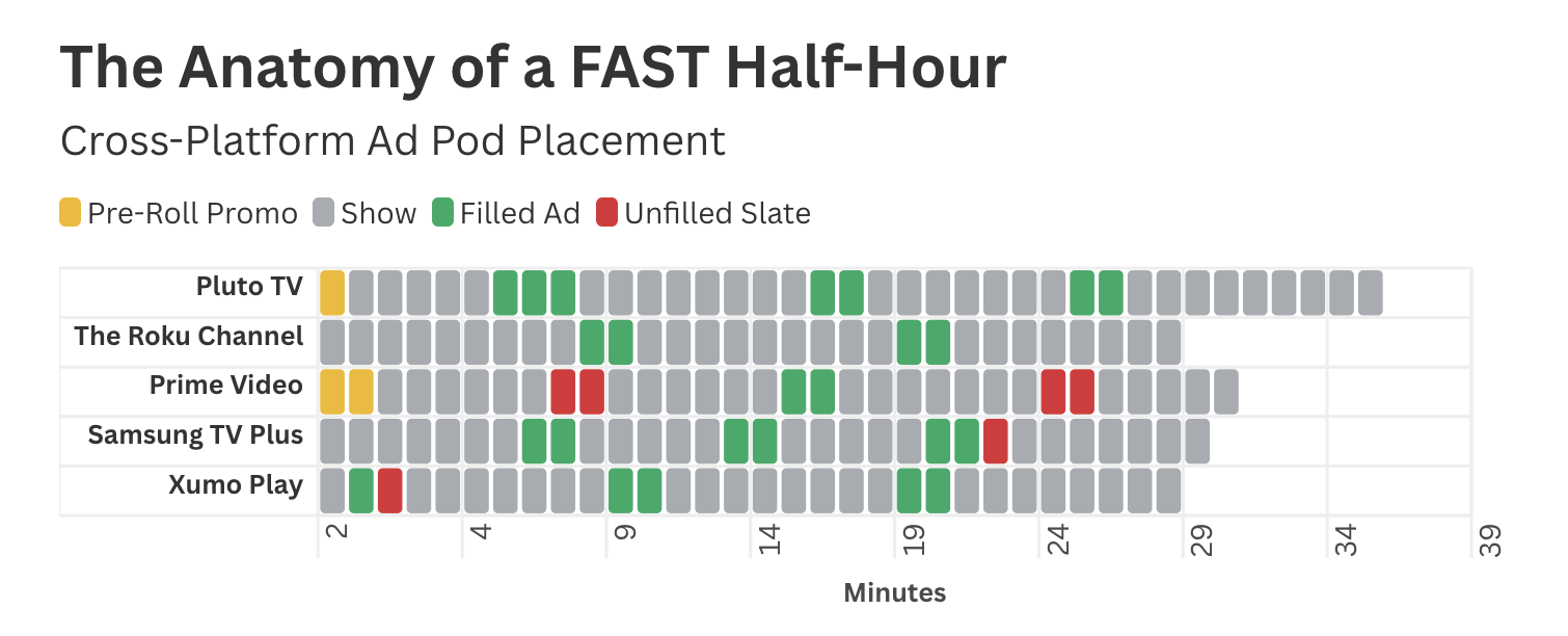 Pluto TV y Roku aparecen con ejecución completa, mientras que Samsung TV Plus y Xumo Play muestran fricción por remanentes al final del pod, y Prime Video destaca como outlier por fallos completos de bloques publicitarios.