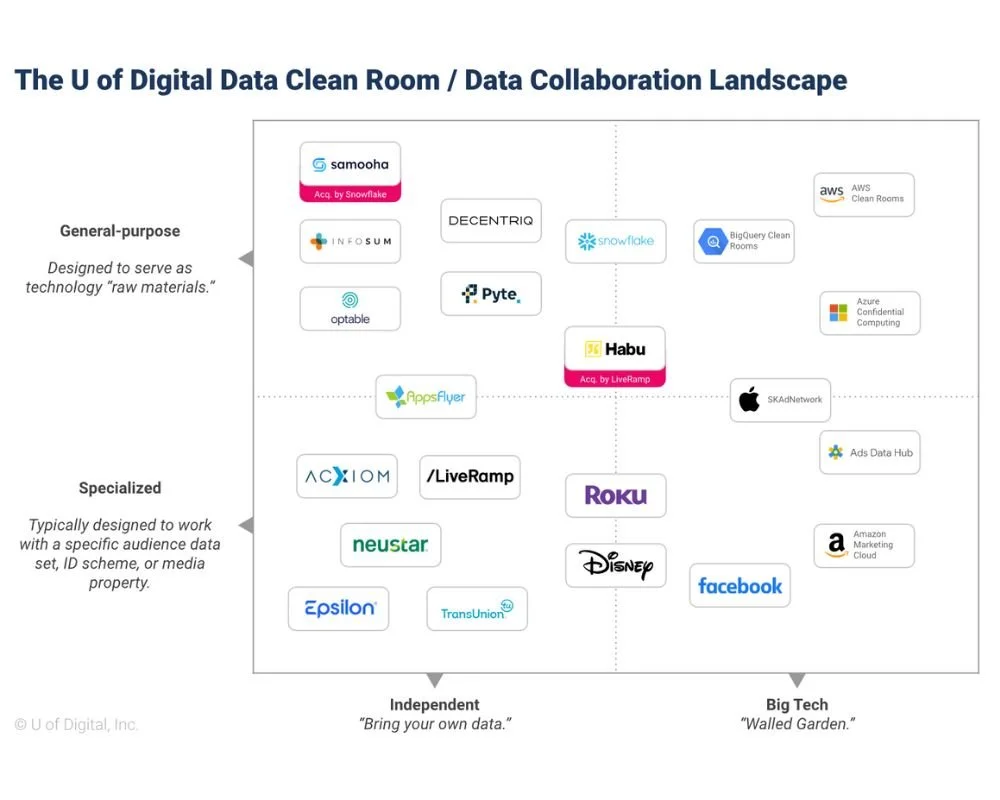 'U of Digital' utiliza un esquema de cuadrantes 2x2 para clasificar las Data Clean Rooms y Data Collaboration en cuatro categorías:
