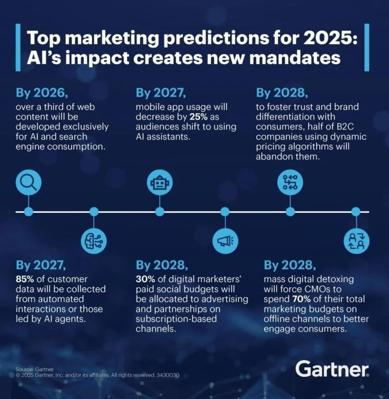 Hay infografías que rellenan el timeline. Otras, sin embargo lo sacuden. La de Gartner sobre las predicciones de marketing para 2025 (y más allá) pertenece, sin duda, a la segunda categoría. Es simple en forma, pero devastadora en contenido. Especialmente si sabes leer entre líneas.