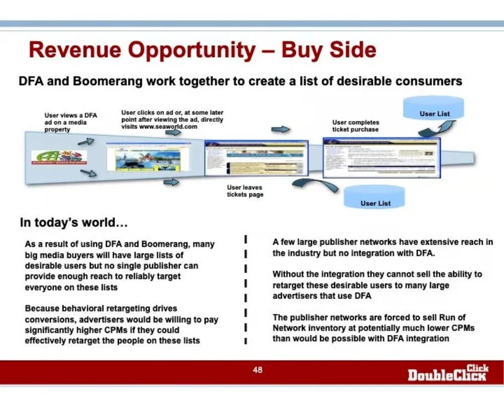 Curiosamente, también se menciona "Boomerang" como una ventaja para el lado de la compra. Boomerang era la solución de retargeting de DoubleClick, aunque en ese momento era un negocio en gran parte inactivo. Sin embargo, la capacidad de los compradores para utilizar su first-party data terminó convirtiéndose en la base de gran parte del ecosistema programático multimillonario y en una innovación clave para empresas como Criteo. Es probable que DoubleClick no comprendiera completamente el potencial que tenía entre manos en ese momento.