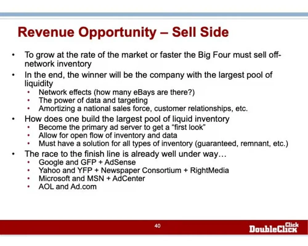 "Convertirse en el principal Ad Server para conseguir el 'first look'": Esto fue antes de que se concibiera el header bidding, por lo que tener acceso exclusivo a inventario que ningún otro competidor podía representar una gran ventaja.