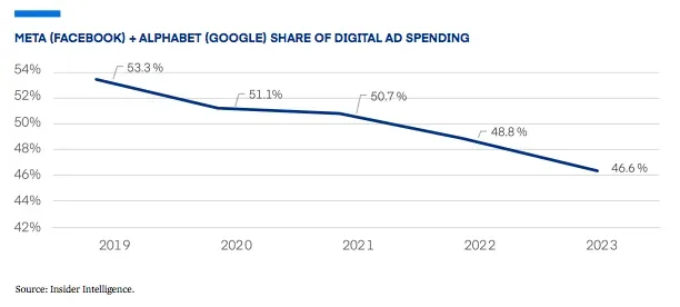 Los gráficos lo muestran con claridad: la cuota combinada de Meta y Google ha caído del 53% en 2019 al 46,6% en 2023. En paralelo, el tiempo de consumo en el open internet ha aumentado hasta el 61%, frente al 39% dentro de Walled Gardens. Es en este desplazamiento donde TTD ha encontrado su espacio: ser el sistema operativo de la Open Web.