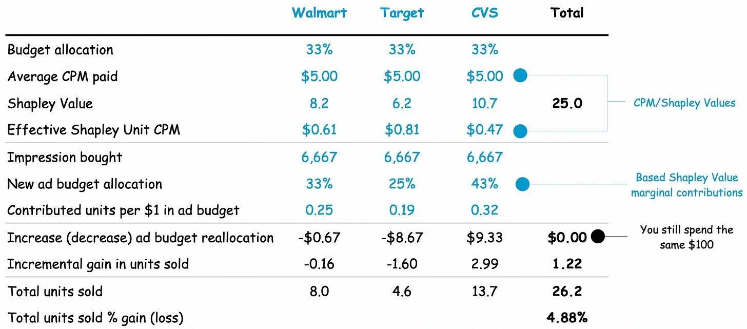 CVS tiene el precio "Shapley" efectivo más bajo, 0,47$ por unidad de contribución marginal. Piensa en esto como un qCPM (por ejemplo, obtener más calidad por cada dólar gastado en publicidad).