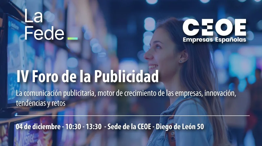 El IV Foro de la Publicidad, organizado por CEOE y La FEDE, se celebrará el 4 de diciembre de 2025 en la sede de CEOE en Madrid. La jornada abordará, mediante ponencias y una mesa redonda, el impacto de la publicidad en la economía y las empresas, así como tendencias clave como la relación cliente–partner, el papel del influencer y la ciberseguridad. El evento concluirá con un espacio de networking entre profesionales del sector.