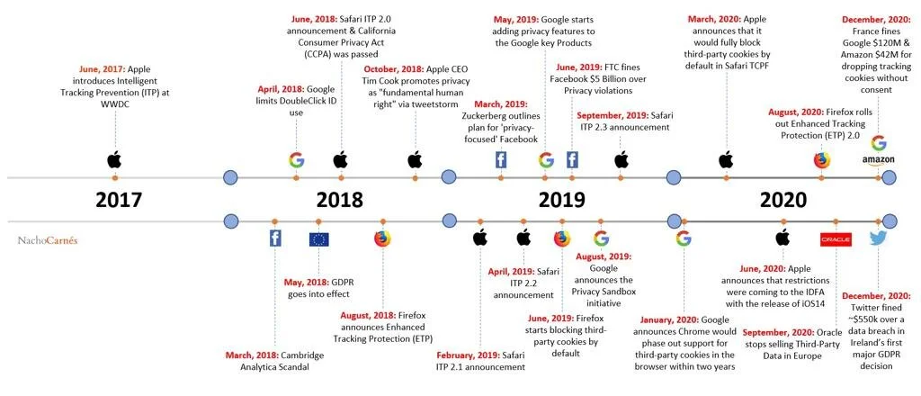 La entrada en vigor de GDPR en Mayo de 2018 así como de otras leyes de privacidad del consumidor como CCPA (leyes dirigidas a garantizar que la recogida, uso y explotación de la data del usuario se lleva a cabo tras su consentimiento y con total transparencia), junto a los movimientos dados por Apple (Safari) y Mozila (Firefox) con el lanzamiento de las diferentes versiones del “Intelligent Tracking Prevention” (ITP) y “Enhanced Trracking Protection “(ETP) respectivamente, y unido a la decisión de Google de eliminar las cookies de terceros de su navegador Chrome a finales del año 2021, están dando origen al surgimiento de un ecosistema digital sin cookies de terceros, de un mundo post-cookie o “Cookieless”, el cual viviremos a partir de 2022.