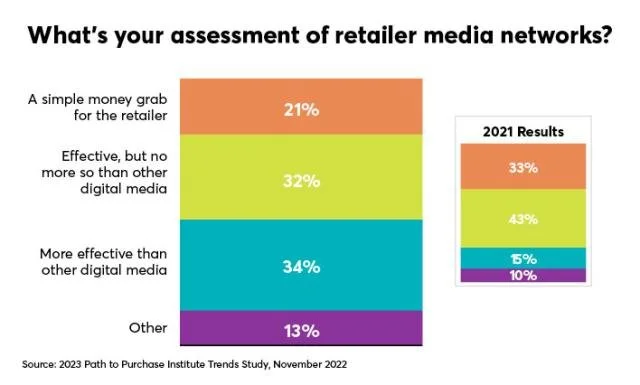 A la pregunta de con qué presupuesto se asigna más a menudo el gasto en Retail Media, el 56% de los encuestados señaló el marketing de compradores, frente al 50% de la encuesta de tendencias del año pasado y del año anterior. A pesar de sus dificultades, el 34% de los encuestados también señalaron que los RMN son más eficaces que otros medios digitales, lo que supone un gran salto con respecto al 15% que lo dijo el año pasado y al 14% del año anterior. Sin embargo, los escépticos siguen siendo el 21%, que señala que las RMN son una simple captación de dinero para el retailer, y el 32%, que afirma que son eficaces, pero no más que otros medios digitales.
