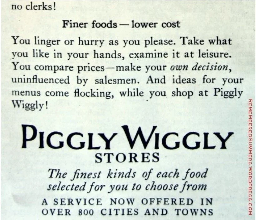 ¿Y recuerdan cuando les pareció pionero el que los supermercados aquí introdujeran pesas para que los clientes pesaran ellos mismos los productos que compraban (generalmente frutas y verduras)? Pues Piggly Wiggly fue el pionero: puso básculas de autopesaje por parte de los clientes en sus tiendas para que pesaran el azúcar y otros productos básicos.