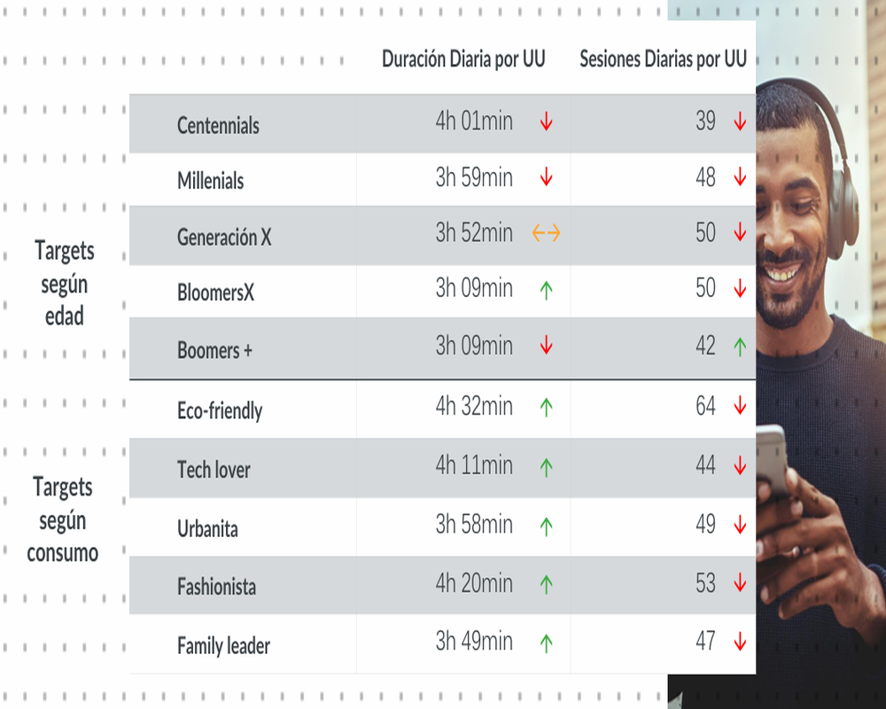 Además, esta iniciativa profundiza en aspectos como la atención a los contenidos dependiendo de la edad y del perfil de consumidor, analizando la permanencia en los distintos sites de Internet. Por ejemplo, el target eco-friendly (es decir, un tipo de consumidor preocupado por el medioambiente y la compra de productos ecológicos y sostenibles) lidera el ranking con una duración diaria por usuario de 4 horas y 32 minutos y 64 sesiones diarias por usuario (cifra que supera la media nacional). Asimismo, se analiza el tiempo que permanecen conectados otros perfiles relevantes en el mercado como los Tech lovers 4 horas y 11 minutos), Urbanitas (3 horas y 58 minutos), Fashionistas (4 horas y 20 minutos)y Family leaders (3 horas y 49 minutos).