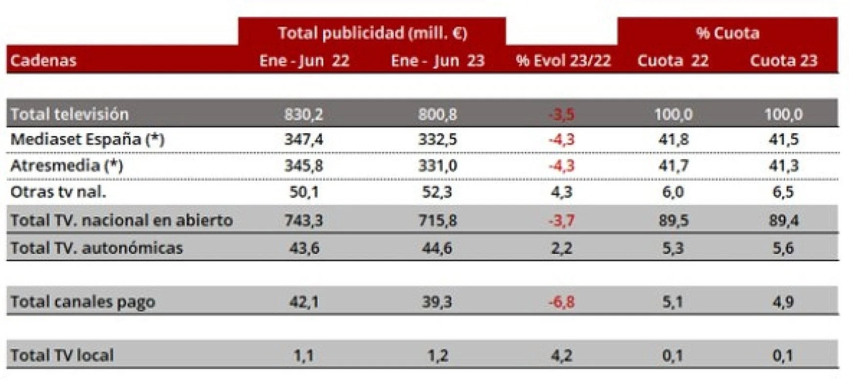 Mediaset España, con un descenso del -4,3%, ha alcanzado una cifra de 332,5 millones, habiendo obtenido así una cuota de mercado del 41,5%. Atresmedia ha alcanzado una cifra de 331,0 millones lo que supone un decrecimiento del -4,3% respecto al mismo período de 2022, situando su cuota en el 41,3%. A su vez, la inversión publicitaria en el grupo de las televisiones autonómicas se situó en los seis primeros meses del año en una cifra de 44,6 millones de euros, con un aumento del 2,2% sobre los 43,6 millones que se registraron en el mismo periodo de 2022.