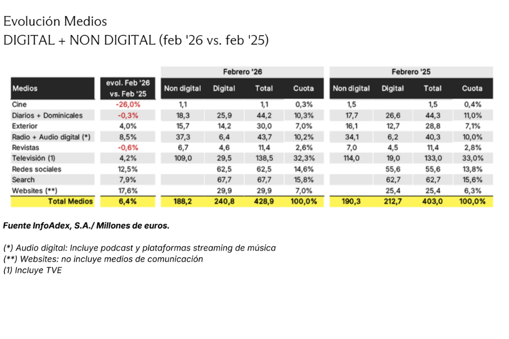 Durante el mes de febrero de 2026, la inversión publicitaria ha alcanzado los 428,9 millones de euros, un 6,4% superior que en el periodo equivalente del año anterior, cuyo volumen registrado fue de 403,0 millones de euros. Incidir en que se añaden en los datos aquellos medios y soportes no controlados directamente por InfoAdex en base a datos declarados/estimados del mercado publicitario. Por ello, los datos que aquí se presentan podrán no coincidir con aquellos que se extraigan de las herramientas que InfoAdex pone a disposición de los usuarios de su información.