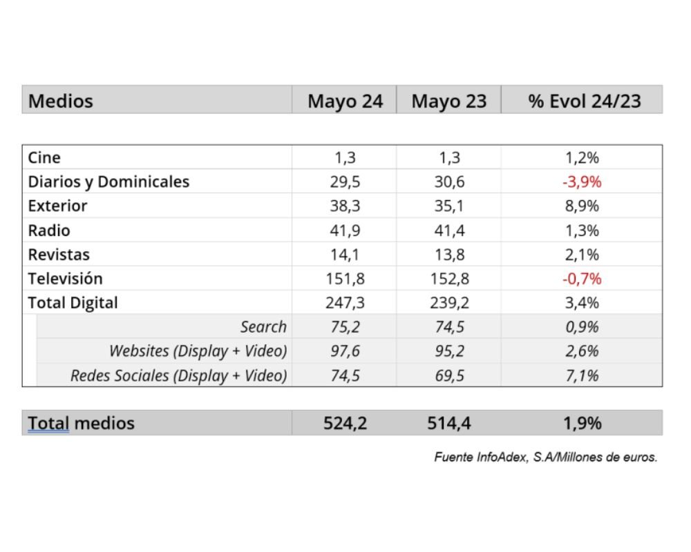 Según el análisis tradicional por medios, presentado por Infoadex, la inversión en medios digitales ha mostrado un notable crecimiento. Digital, que lidera por volumen de inversión publicitaria, experimentó un incremento del 3,4%, alcanzando los 247,3 millones de euros en mayo de 2024. Dentro del sector digital, las Redes Sociales destacaron con un crecimiento del 7,1%, pasando de 69,5 millones de euros en mayo de 2023 a 74,5 millones en el mismo mes de 2024.