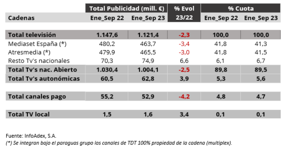 La inversión publicitaria en televisión ha disminuido un -2,3% en los nueve primeros meses de 2023, respecto a la cifra conseguida en el mismo período del año anterior, pasando de 1.147,6 millones de euros en eneroseptiembre del 2022 a los 1.121,4 millones alcanzados este año.