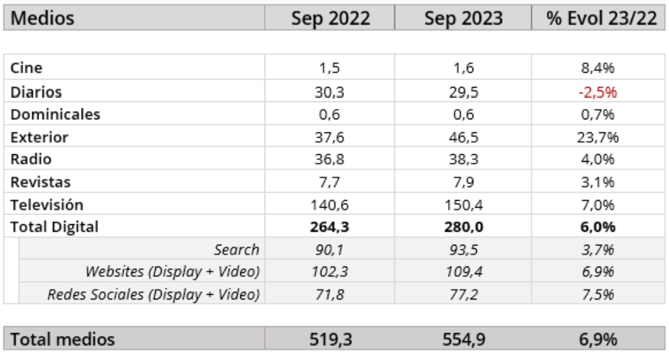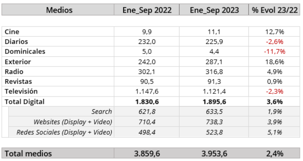 En los nueve primeros meses del año, la inversión publicitaria ha crecido un 2,4% frente al período equivalente del año anterior, mostrando una cifra de 3.953,6 millones de euros, frente a los 3.859,6 millones del periodo enero-septiembre de 2022. En el caso concreto del mes de septiembre, la inversión habría crecido un 6,9% pasando de los 519,3 millones de euros de 2022 a los 554,9 millones del mes de septiembre de 2023.
