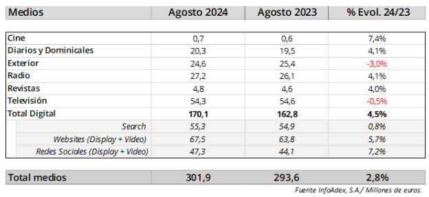 Durante el mes de agosto de 2024, la inversión publicitaria ha alcanzado los 301,9 millones de euros, un 2,8% más que en el periodo equivalente del año anterior cuando el volumen registrado fue de 293,6 millones de euros.
