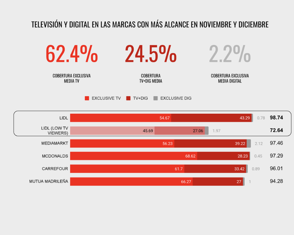 Lidl fue la marca con mayor alcance entre las marcas que más presión publicitaria hicieron en los meses de noviembre y diciembre, al llegar al 98,7% de la población. La TV aportó el 54,7% de ese alcance en exclusiva, mientras que el 43,3% fue alcanzado por ambos entornos de forma simultánea y el 0,8% restante correspondió a digital en solitario. Es una de las conclusiones del ranking bimensual de FLUZO, que mide las grandes campañas cross-media de los anunciantes con mayor inversión televisiva y presencia en Digital en España desagregando el aporte de cada medio.