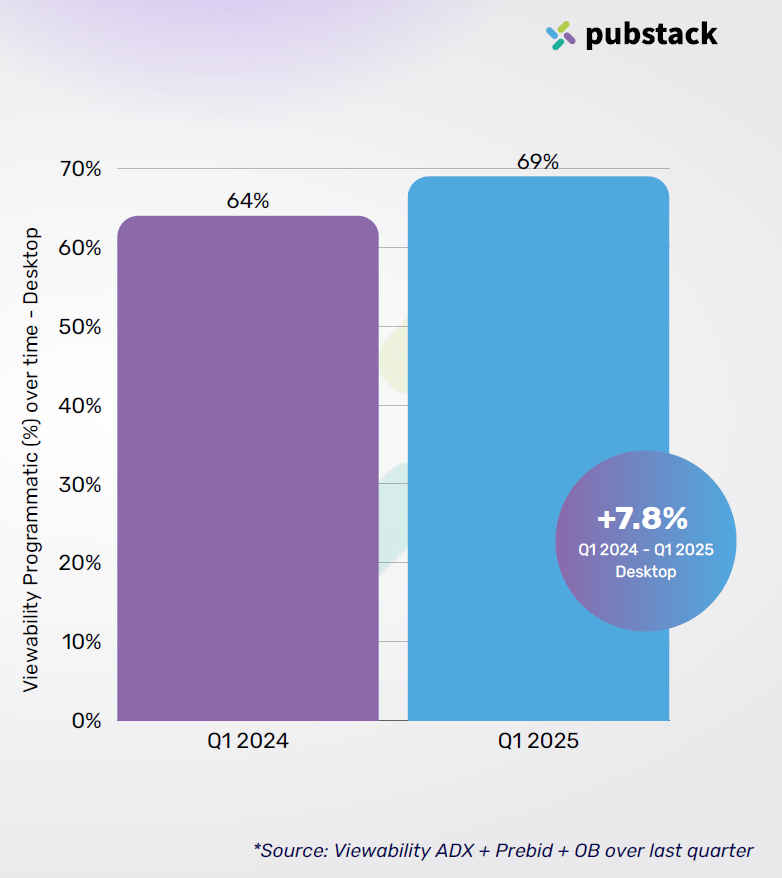 El informe también confirma que una mayor viewability se traduce en mejores ingresos. La viewability media en desktop ha pasado del 64% al 69 %, y en mobile del 61% al 65%. Además, los publishers con viewability superior al 60 % registran CPMs un 25% más altos que aquellos por debajo de ese umbral.