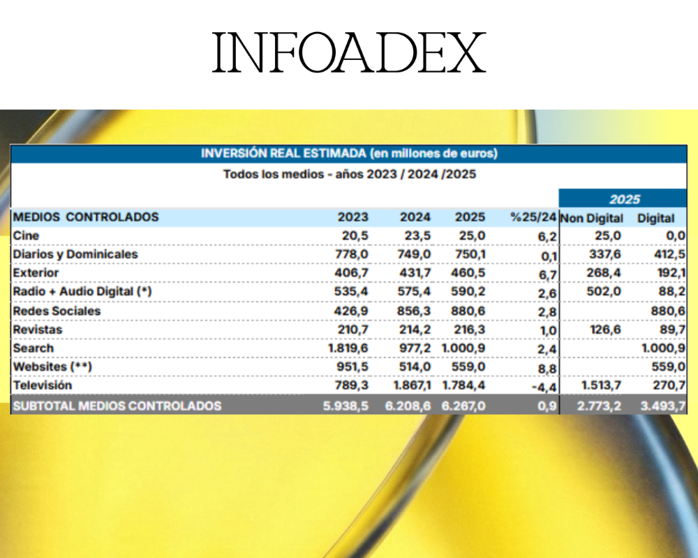 La inversión real estimada en medios controlados alcanzó los 6.267,0 millones de euros durante el año 2025, cifra que representa un incremento del 0,9% sobre la registrada en 2024. Durante el año que está siendo analizado, todos los medios han aumentado su inversión respecto a 2024, salvo Televisión, que presenta una caída del -4,4%.