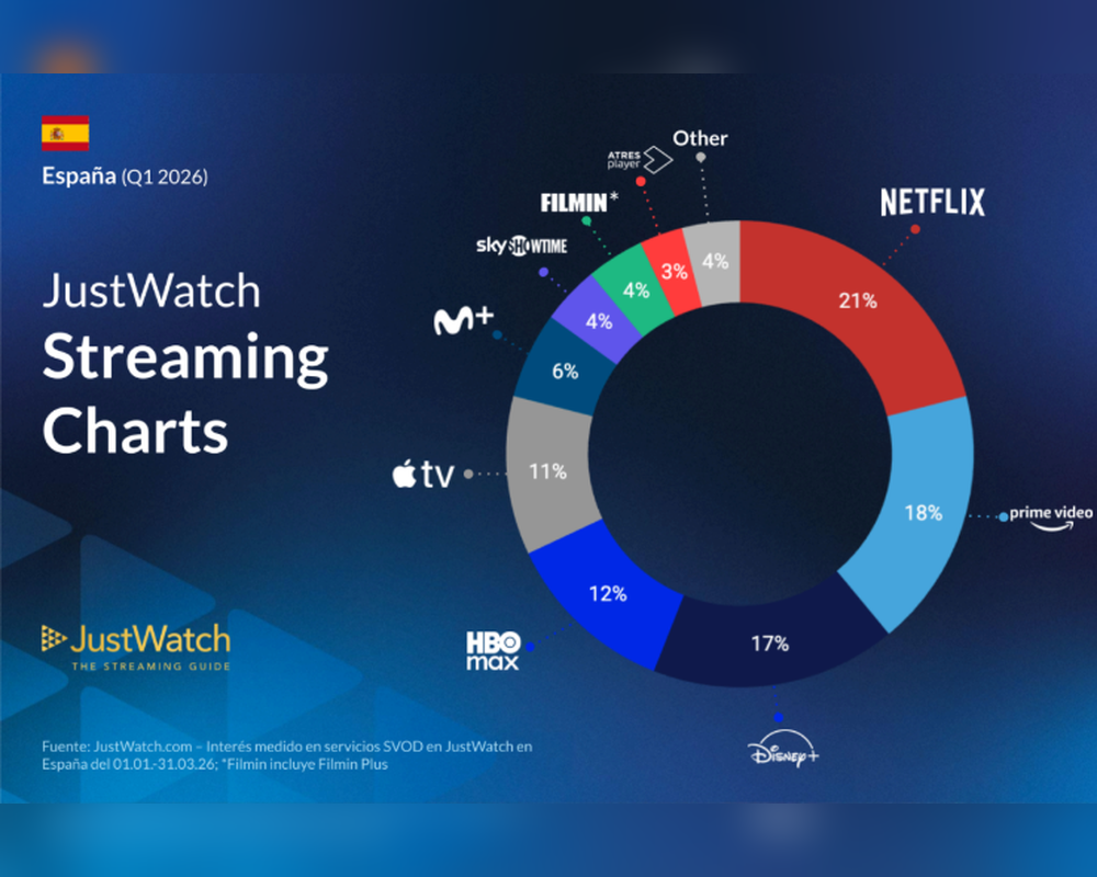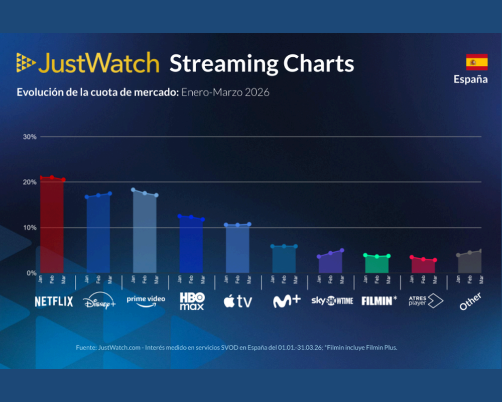 JustWatch ha publicado las variaciones sobre la participación de mercado de las principales plataformas en 60 países. Este análisis de las cuotas de mercado de las plataformas de streaming por suscripción (SVOD) en el primer trimestre de 2026 se calcula en función de la actividad de los 4,5 millones de usuarios mensuales de JustWatch en España, incluyendo acciones como hacer click en una oferta de streaming, añadir un título a la lista de seguimiento o marcar un contenido como "visto". Los resultados reflejan los datos que recopilan durante los últimos 3 meses: