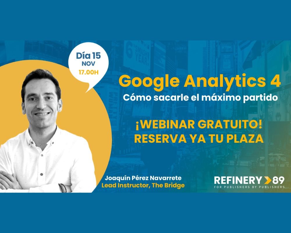 Por este motivo, Refinery89, empresa dedicada a la publicidad programática en Europa y Latinoamérica, organiza, con la colaboración de Joaquín Pérez Navarrete, Lead Instructor en The Bridge, un webinar gratuito el próximo 15 de noviembre para analizar en profundidad Google Analytics 4 (GA4) y analizar todas sus novedades.