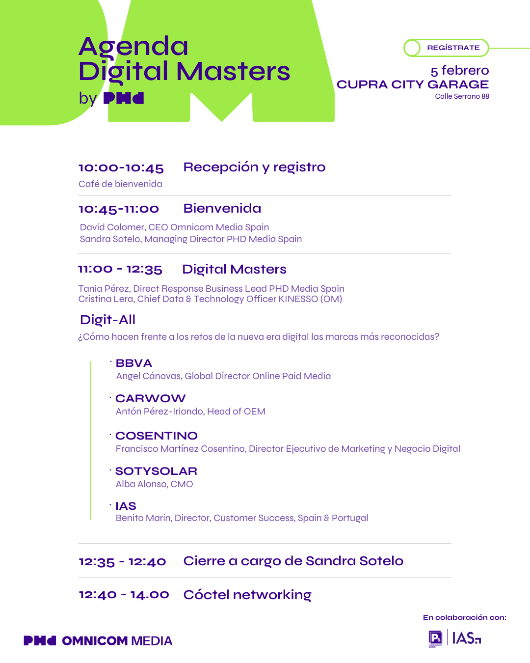 Llega la 5ª edición del Digital Masters by PHD, un encuentro único y 100% presencial y en horario de mañana, donde los anunciantes líderes del sector digital nos revelarán las claves de su enfoque de performance y cómo traducen la estrategia en resultados de negocio.
