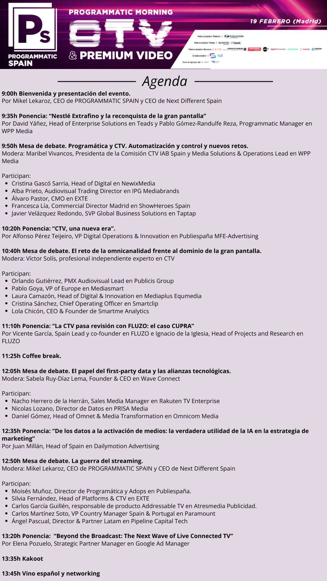 Pablo Goya (Mediasmart)Carlos García Guillén (Atresmedia)Orlando Gutiérrez (Publicis)Sabela Ruy-Díaz (Wave Connect)Alba Prieto (IPG Mediabrands)Pablo Gómez-Randulfe (WPP Media)Francesca Lía (ShowHeroes)Mikel Lekaroz (Next14)Víctor Solís (Especialista Programática y CTV)Carlos Martínez (Paramount)Nacho Herrero (Rakuten TV Enterprise)Moisés Muñoz (Publiespaña)Álvaro Pastor (EXTE)Maribel Vivancos (WPP Media)Laura Camazón (Mediaplus Equmedia)Lola Chicón (Smartme Analytics)David Yáñez (Teads)Javier Velázquez Redondo (Taptap Digital) Juan Millán (Dailymotion Advertising)Cristina Sánchez (Smartclip)Elena Pozuelo ( Google Ad Manager)Ángel Pascual (Pipeline Capital) Ignacio de la Iglesia (FLUZO)Nico Lozano (PRISA Media)Vicente García (FLUZO)Daniel Gómez (Omnicom Media)Cristina Gascó (NewixMedia)Silvia Fernández (EXTE)