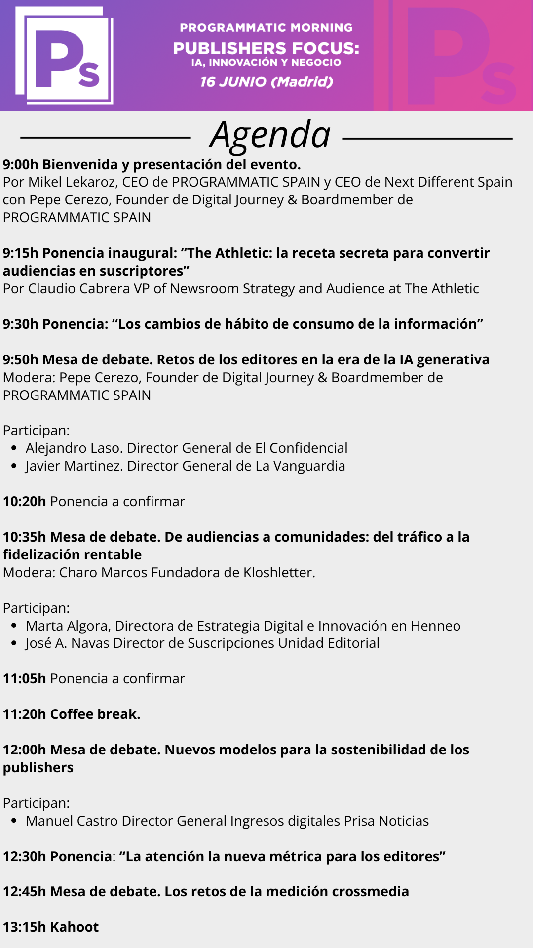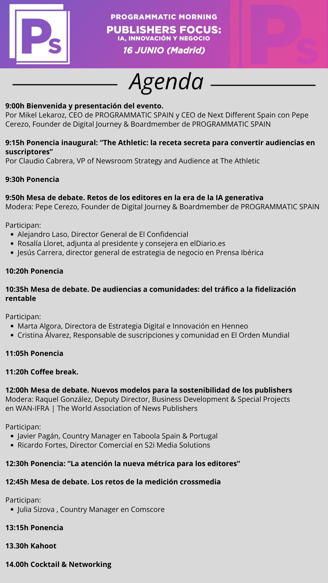 Venir al PROGRAMMATIC MORNING Publishers Focus: IA, innovación y negocio merece la pena si trabajas en un medio (o con medios) y necesitas respuestas prácticas a las dos grandes preguntas de 2026: cómo proteger el valor del contenido cuando la distribución se vuelve “asistida” por IA, y cómo convertir audiencias volátiles en ingresos sostenibles. Además, esta edición es una de las grandes novedades en la programación de eventos de PROGRAMMATIC SPAIN específicamente dedicada a los publishers. En una misma mañana verás un caso real y accionable (The Athletic y su integración en The New York Times) y, sobre todo, debates de alto nivel sobre los retos de la IA generativa (tráfico, procesos editoriales y modelo de negocio), el paso de tráfico a comunidad rentable, los modelos híbridos publicidad y suscripción, la atención como métrica y la medición crossmedia. Todo en un formato diseñado para aprender, contrastar decisiones con otros líderes del sector y salir con ideas que puedes aplicar al día siguiente