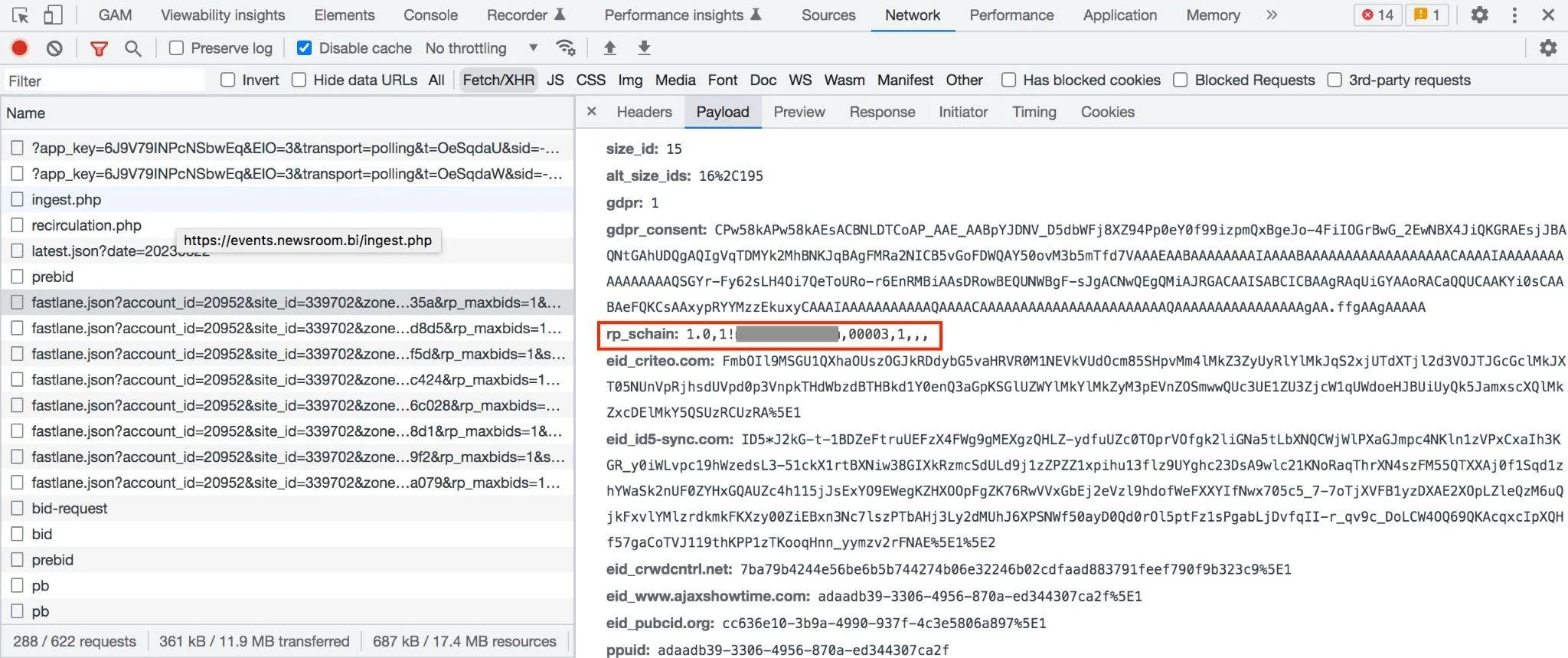 Ir a tu site -> Chrome DevTools -> Red -> Filtrar por "bid?" (Amazon). En el payload puedes ver los nodos SCO enviados en la petición de puja.