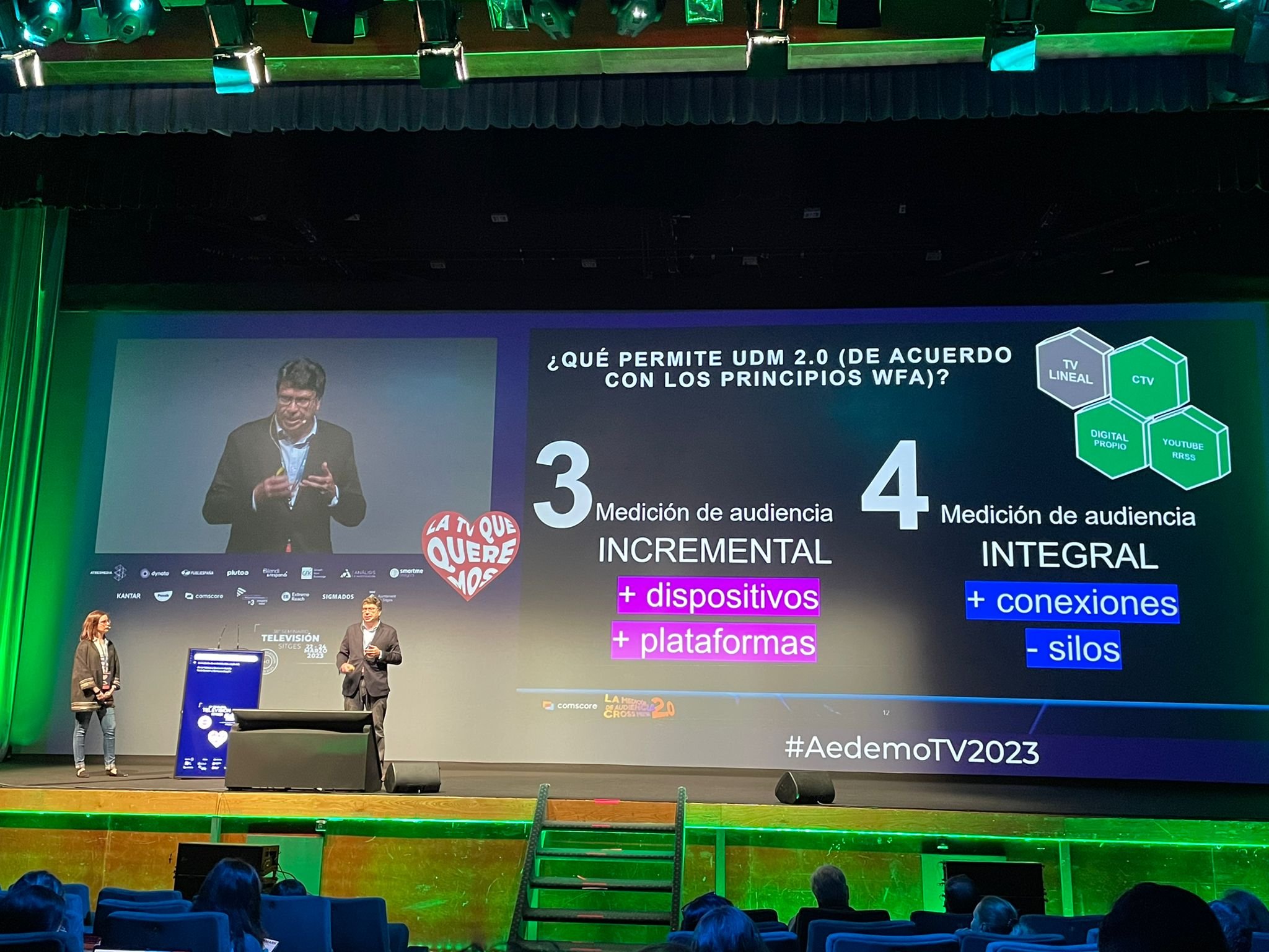 Los siguientes en aparecer sobre el escenario han sido Jaime Agullo, VP Managing Director South EMEA en comScore y Paula Sansans, Senior Analyst, Syndicated Client Insights de comScore España con la ponencia titulada 'La medición de audiencia cross media 2.0'. En ella se ha aprovechado para mostrar a los asistentes como se ha realizado un proyecto piloto con la asociación de anunciantes de Estados Unidos, siendo Comscore el proveedor y coordinador tecnológico para la medición de plataformas con el objetivo de generar un currency. A día de hoy se ha conseguido una medición de contenidos con First-Party IDs.
