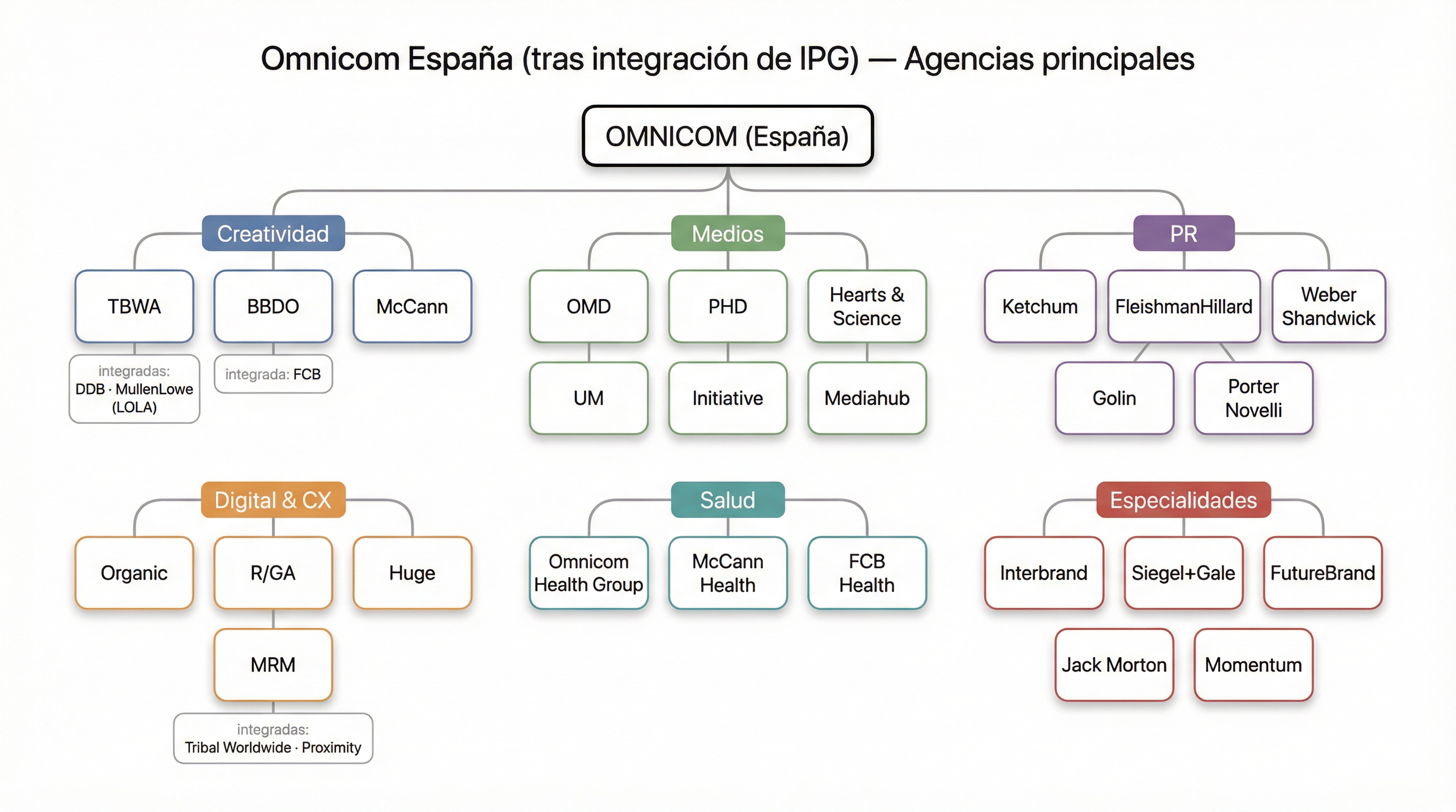 La nueva Omnicom reestructura el mercado español con TBWA, BBDO y McCann al frente de creatividad; seis redes activas en medios; y PR unificado sin perder identidad de marca.
