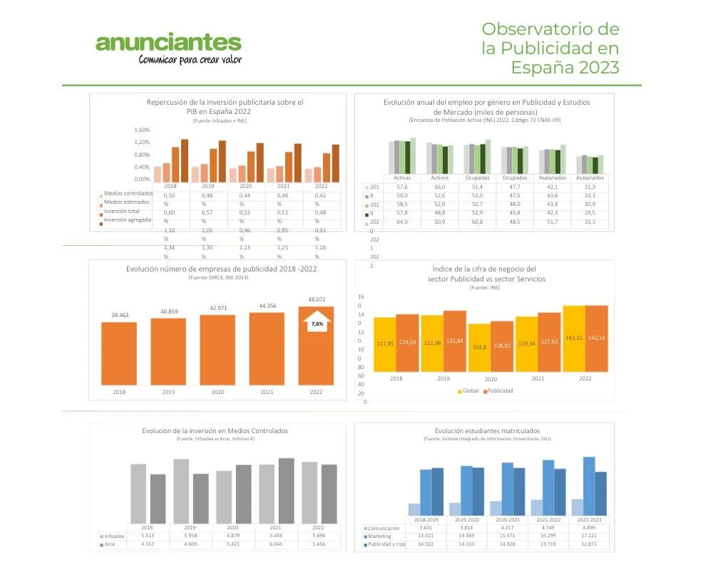 Según los últimos datos del informe, continúa la relevancia del impacto económico de la actividad publicitaria. Los números registran un alza en el número de empresas, empleo, cifra de negocio, e inversión entre los principales factores económicos.