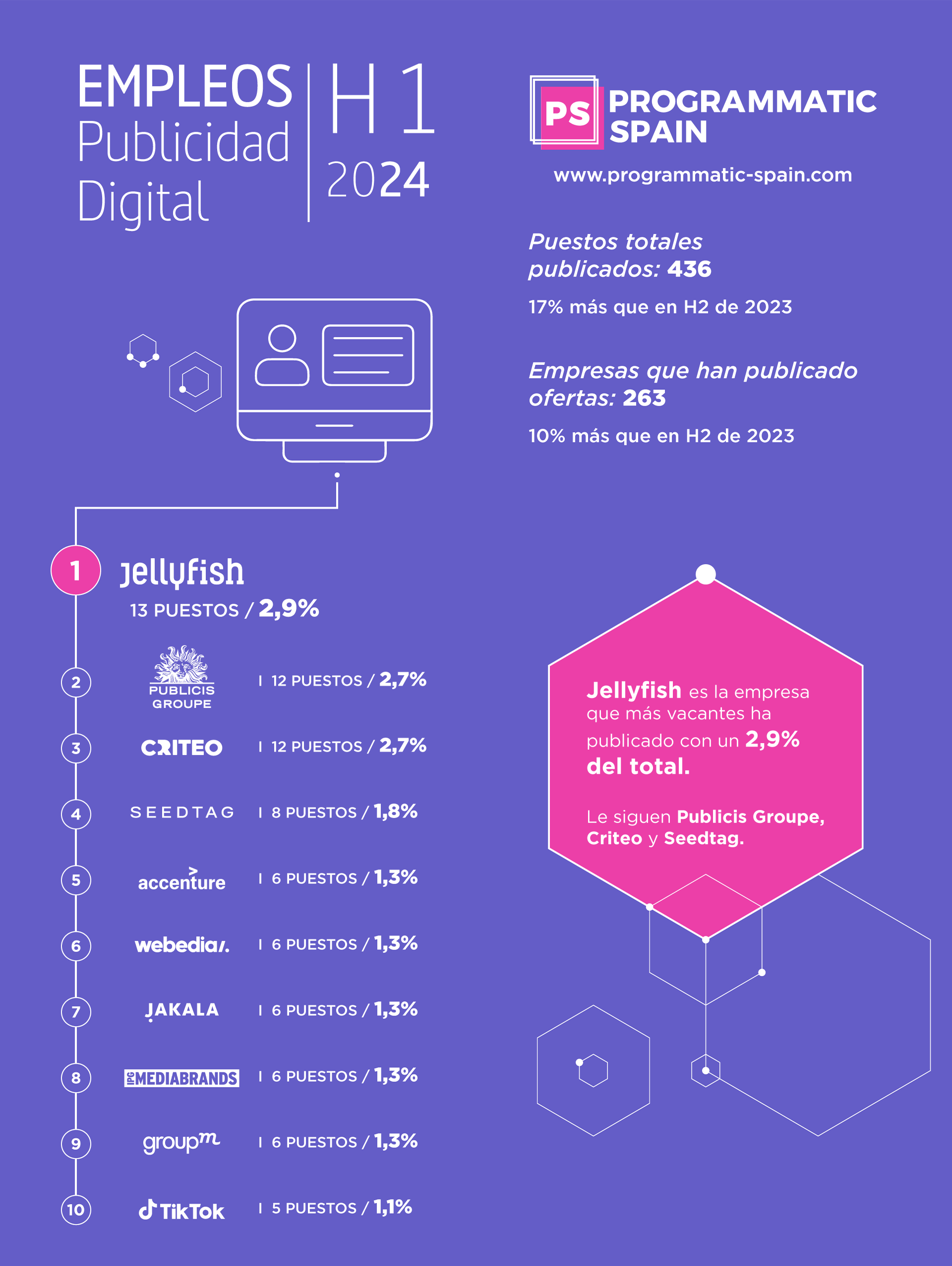 La infografía, que analiza diversas métricas del mercado laboral, señala que 263 empresas han publicado ofertas de empleo en este período, lo que supone un incremento del 10% respecto al semestre anterior. Jellyfish encabeza la lista de compañías con más vacantes, representando el 2,9% del total, seguida de Publicis Groupe, Criteo y Seedtag.