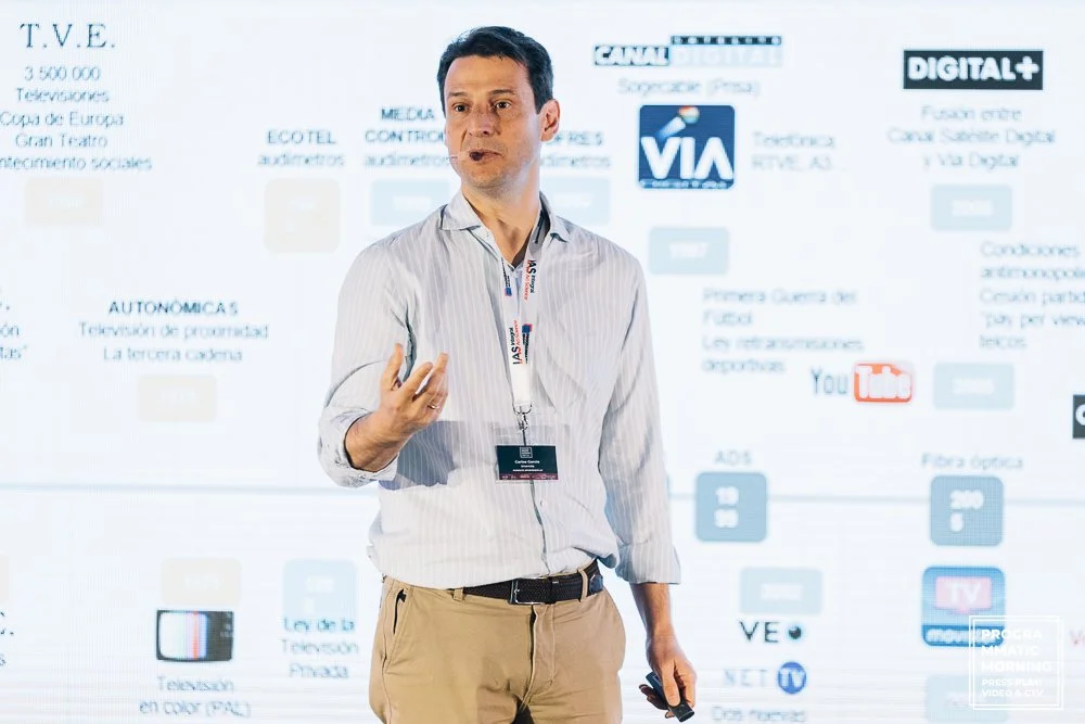 Para poner en contexto la situación actual de la televisión, Carlos García Amo hizo un viaje por las 7 últimas décadas explicando cómo ha sido la evolución de este medio. Desde sus inicios, cuando apenas 50 familias en España contaban con un televisor, hasta la actualidad, una época marcada por la expansión de canales y el live streaming, la televisión ha pasado por varias fases: democratización, digitalización, multipantalla y la recientemente iniciada VOD & OTT.