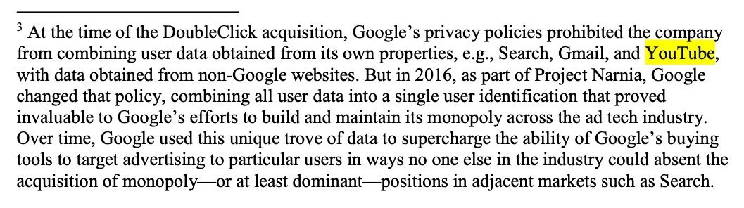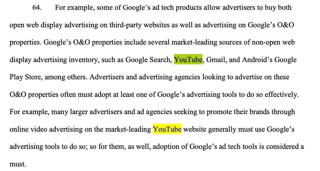 En la pagina 29 hay una discusión muy limitada de la vinculación de YouTube con DV360 a pesar de que tiene un gran efecto anti-competitivo. Esto es casi un argumento descartable; de hecho, la palabra "YouTube" solo aparece 6 veces en toda la demanda.