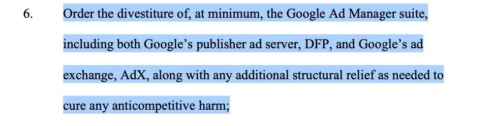 Lo que se pide en la página 144 de la demanda es la desinversión de GAM y AdX, pero no habla de ninguna desinversión en el lado de la compra. Esto es interesante, porque es probable que Google prefiera lo contrario …