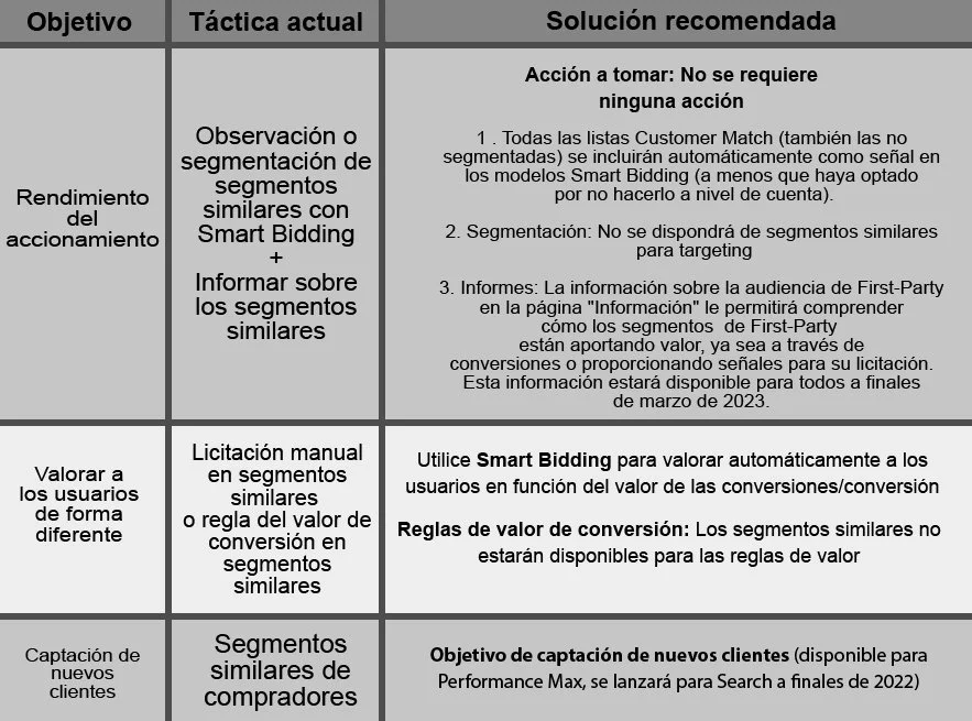 En cuanto a las audiencias similares en concreto, el cambio supondrá la transición de estas audiencias a una solución de segmentación más automatizada.