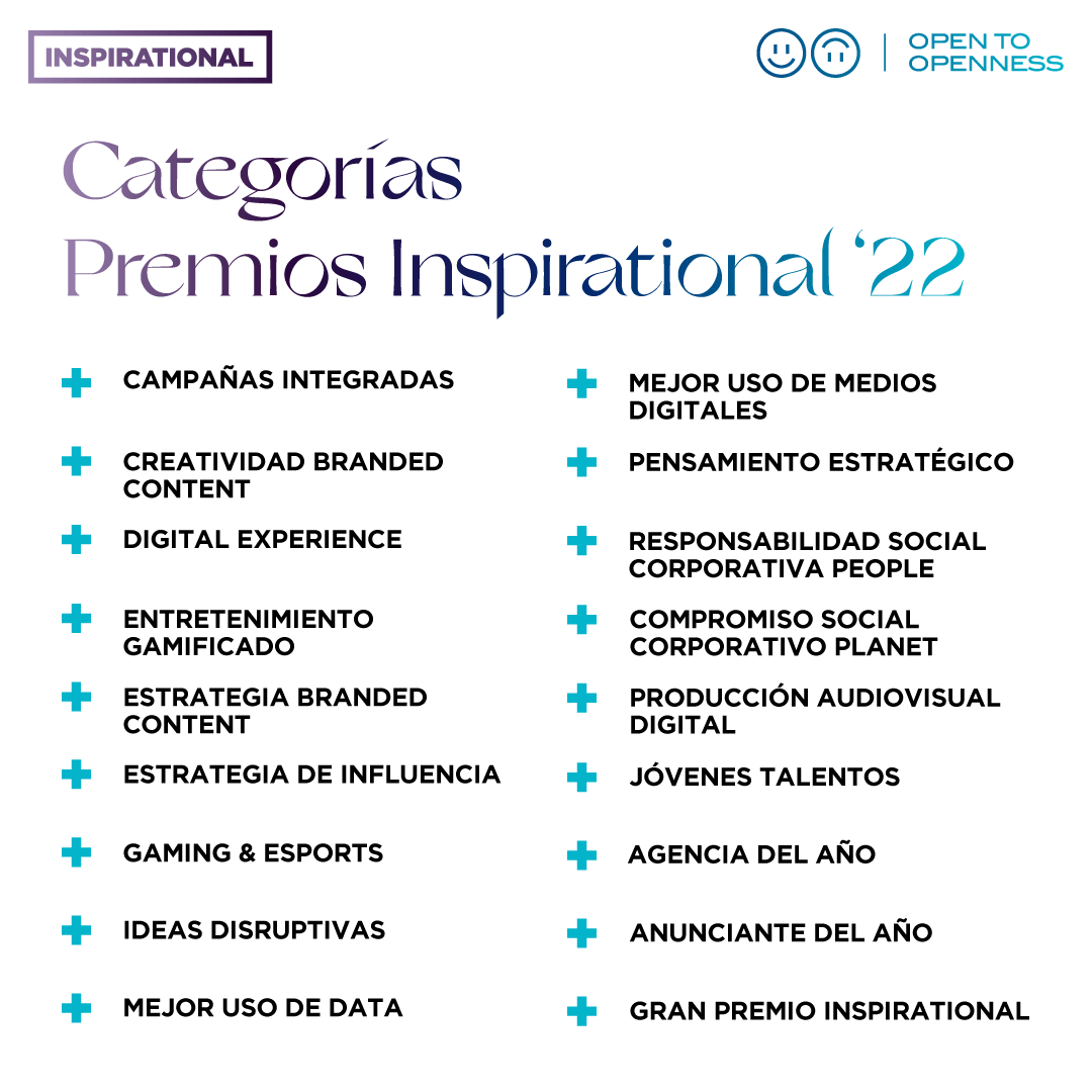 Desde hoy, y hasta el 14 de septiembre, permanecerá abierto el plazo de inscripción en los Premios Inspirational que reconocen las campañas, proyectos y empresas más inspiradoras para el sector de la comunicación y publicidad en entornos digitales. Las piezas que participen deben ser proyectos exhibidos entre septiembre de 2021 y septiembre de 2022.