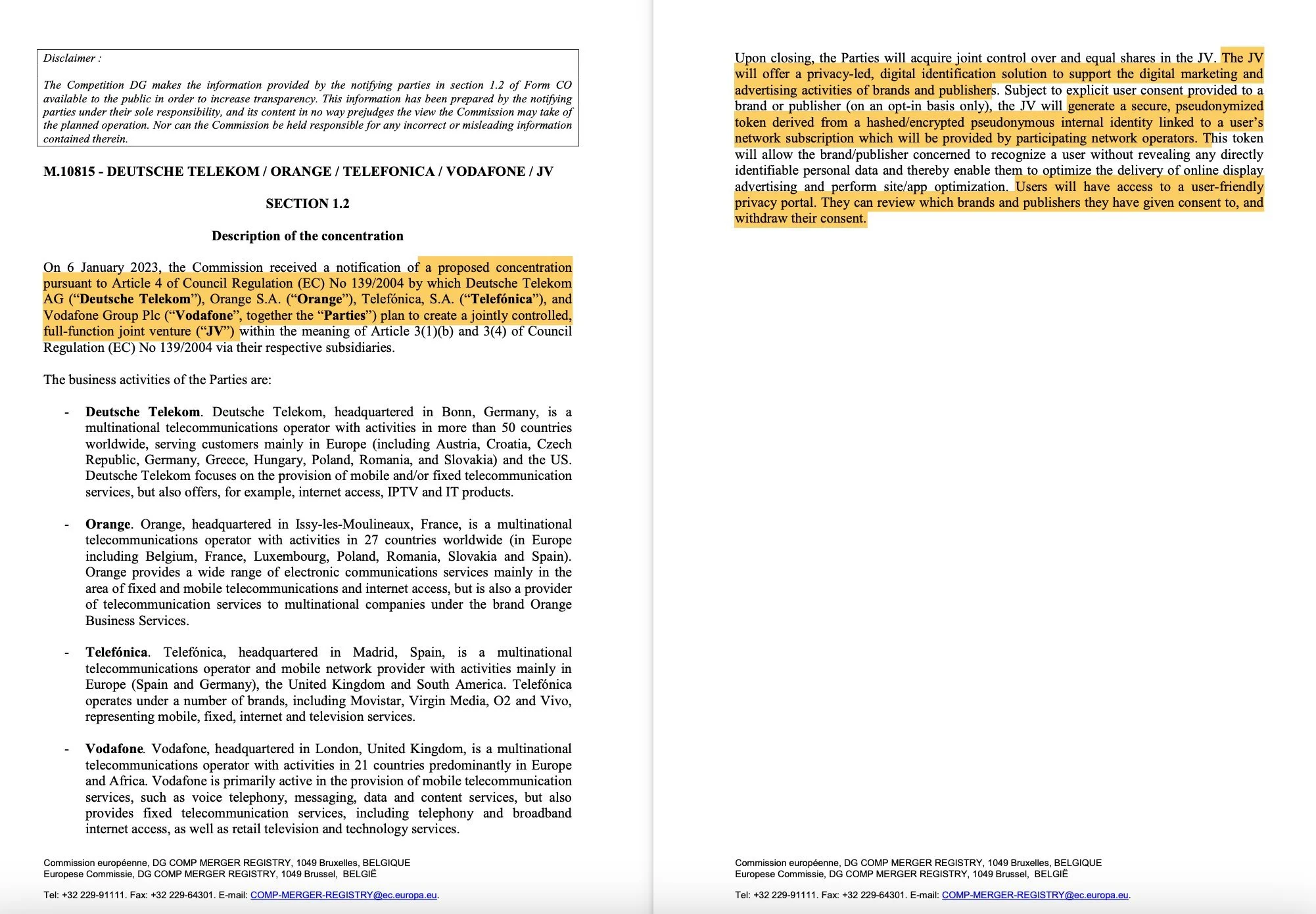 En una solicitud presentada a la división de Competencia de la Comisión Europea (adelantada por Politico), la alemana Deutsche Telekom, la francesa Orange, la española Telefónica y la británica Vodafone exponen la propuesta de concentración para crear una empresa conjunta controlada conjuntamente y participada a partes iguales, con el fin de ofrecer "una solución de identificación digital basada en la privacidad para respaldar las actividades de marketing y publicidad digital de marcas y publishers", tal como describen la infraestructura propuesta de segmentación publicitaria de First-Party Data.