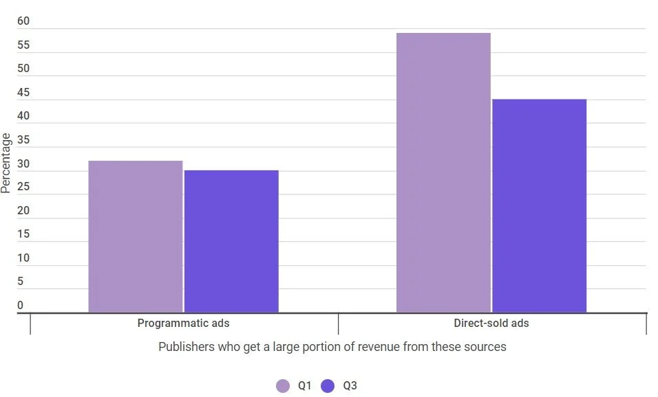 El porcentaje de profesionales de publishes que afirmaron obtener una gran parte de sus ingresos de la publicidad de venta directa cayó al 45% en el tercer trimestre, frente al 59% de principios de año.