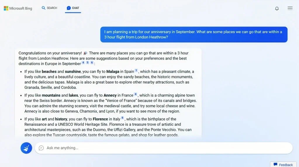 Una nueva experiencia de chat. Para búsquedas más complejas —como planear un itinerario de viaje o buscar qué televisor comprar—, el nuevo Bing ofrece un nuevo chat interactivo. La experiencia de chat te permite refinar tu búsqueda hasta que recibas la respuesta completa que buscas, ya que te pide más detalles, explicaciones e ideas —con enlaces disponibles para que puedas tomar decisiones de inmediato—.