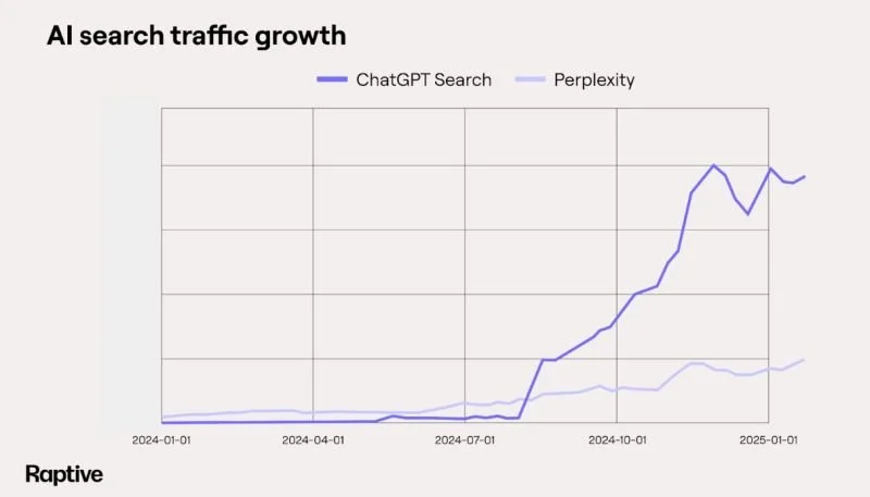 Desde su lanzamiento, el tráfico de ChatGPT ha crecido significativamente: ya atrae 4 veces más tráfico que Perplexity, que ha mantenido el crecimiento en el tiempo. Aunque aún son cifras muy pequeñas (menos del 1% del tráfico global), las predicciones indican que seguirá en ese misma línea. Con este cambio de OpenAI, es posible que ChatGPT Search se convierta en una fuente importante de tráfico en los próximos 12 meses.
