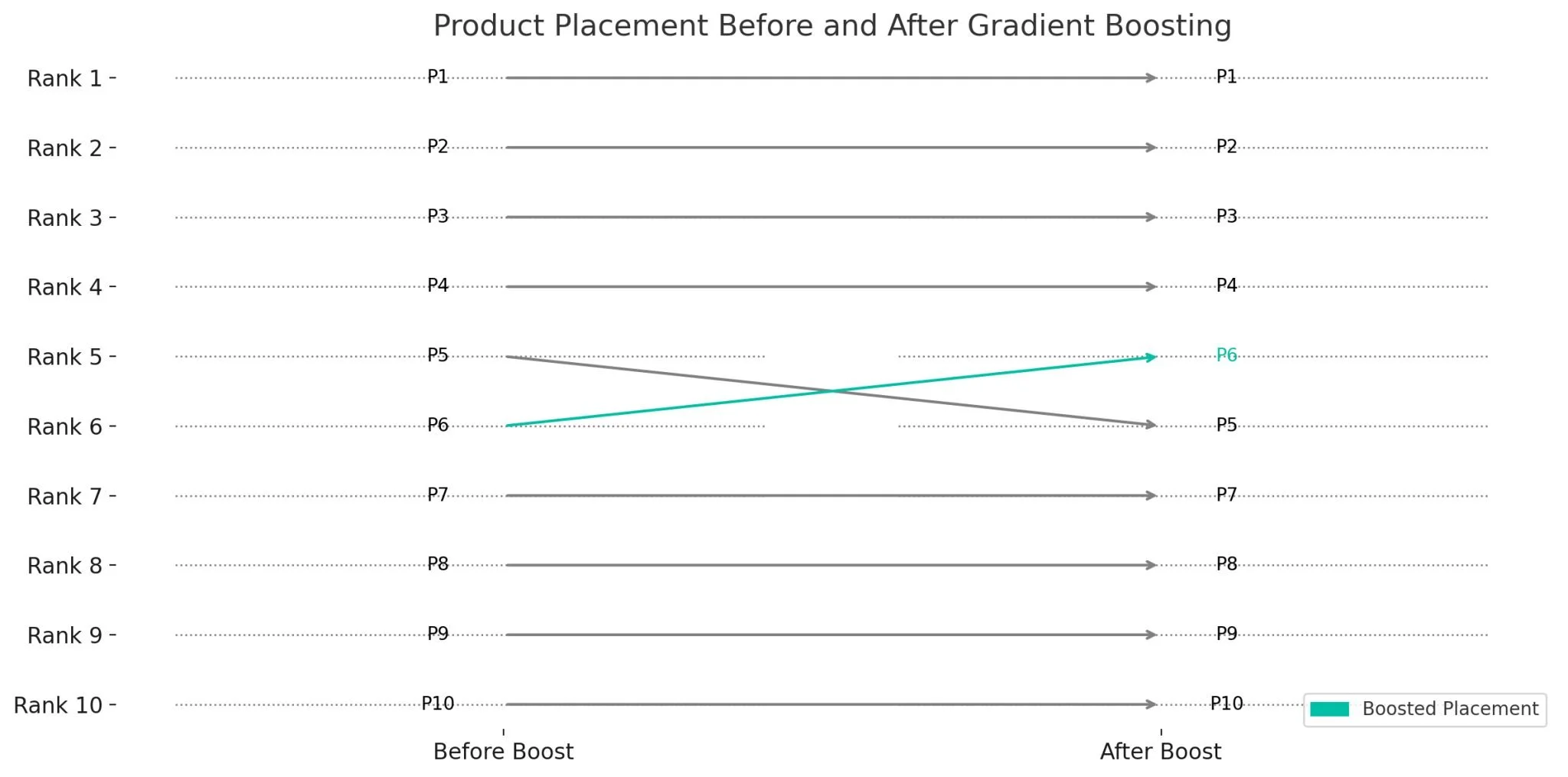 El Gradient Boosting consiste en dar el "empujón justo" a los productos patrocinados dentro del ranking de resultados. No se trata de teletransportarlos al puesto número 1, sino de permitir que suban algunos escalones si tienen cierto nivel de relevancia o encaje contextual. En vez de romper el motor de búsqueda, se optimiza con lógica probabilística, teniendo en cuenta el rendimiento esperado, la intención del usuario, y el contexto de inventario. Un producto en la posición 1.000 no debe aparecer de repente en la primera posición, pero sí puede subir posiciones si cumple ciertos criterios; esto mejora la rentabilidad sin sacrificar confianza o relevancia.