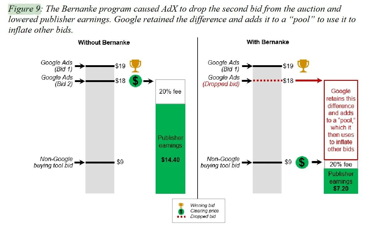 Como muchos editores sospecharon durante años, Google parece haber estado participando en una especie de subasta de tercer precio. Desde su posición privilegiada tanto en el lado de la demanda como en el lado de la venta, Google podía ver todas las ofertas que llegaban. Los DSP’s no sabrían si presentaban la oferta más alta o no, y los editores no sabrían el rango de ofertas que se realizan. Google Ads (anteriormente conocido como Google Display Network o GDN) pagaría a los editores según la oferta más baja y cobraría a los anunciantes según la oferta más alta y por consiguiente Google se embolsaría la diferencia o aplicaría la diferencia para aumentar el precio de oferta para ganar una subasta posterior. Google solo usó este programa (conocido como "Global Bernanke") cuando los compradores compraban a través del SSP de Google, AdX, donde tenía visibilidad completa de todas las ofertas y podía usar esa información para inclinar la balanza a su favor.