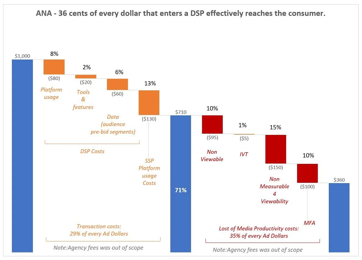 Otro dato preocupante es que sólo 36 céntimos de cada dólar que entra en un DSP llega al consumidor. Según ANA, unos 29 céntimos se destinan a honorarios de intermediarios AdTech y 35 céntimos a medios de baja calidad, incluido el tráfico no válido y los made-for-advertising (MFA), no visible y no medible.